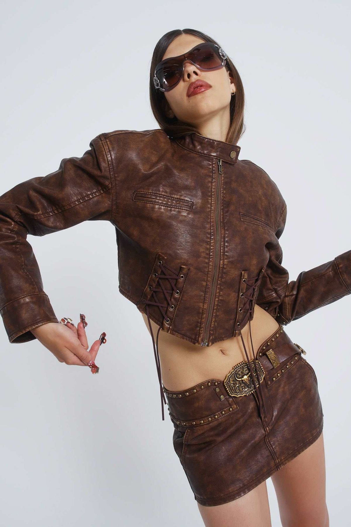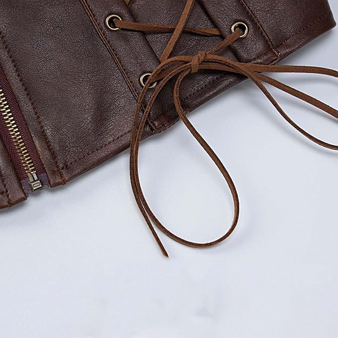 This Easy Rider Faux Leather Jacket captures a rebellious spirit with its rich brown, distressed-look faux leather. The standout feature is the corset-style lacing on both sides of the front, adding an edgy and customizable silhouette. This versatile piece is perfect for adding a touch of vintage-inspired cool to any outfit, ideal for layering during transitional seasons.
