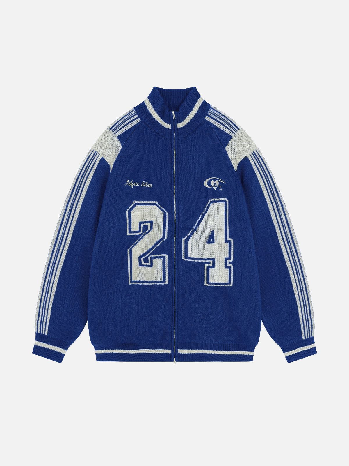 The Fvshya 24 Jacquard Zip Up Cardigan features a unique burgundy color paired with vintage number jacquard patterns, highlighting a natural, laid-back, and sporty casual vibe.