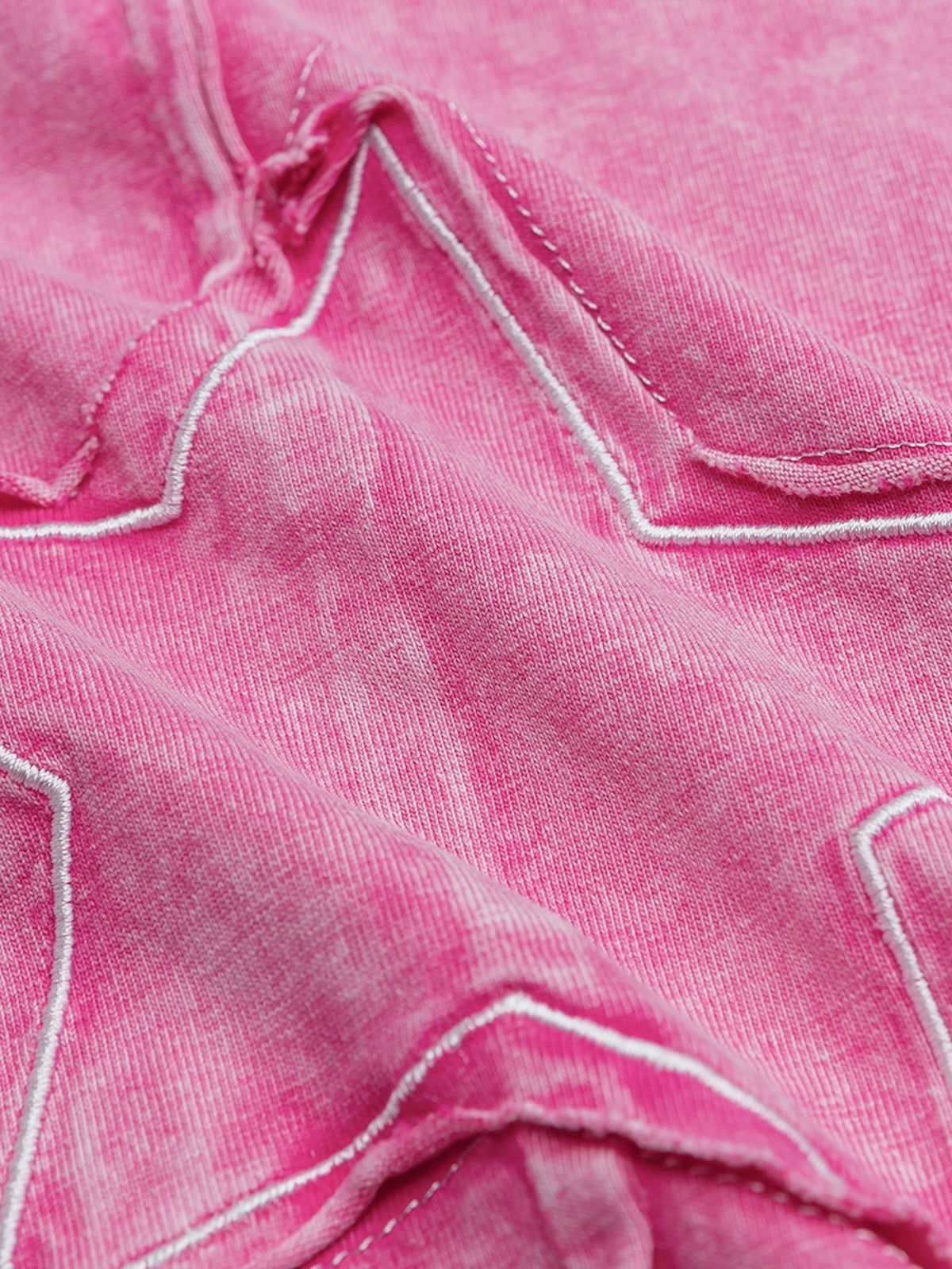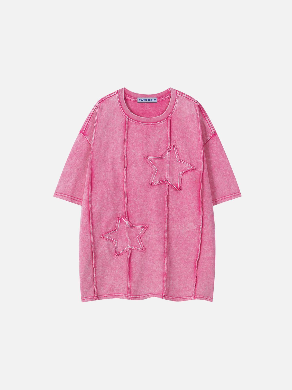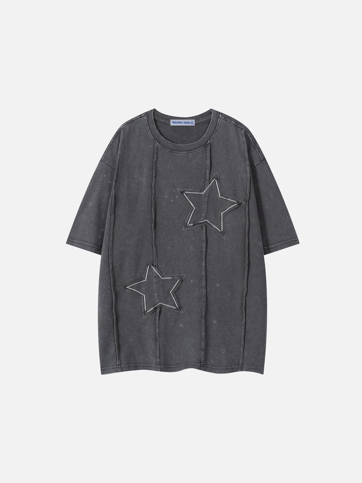 This applique embroidery star washed tee features intricately embroidered stars on a washed cotton fabric, adding a unique touch to a classic design. Made with high-quality materials, this tee is both comfortable and stylish, perfect for any casual occasion.