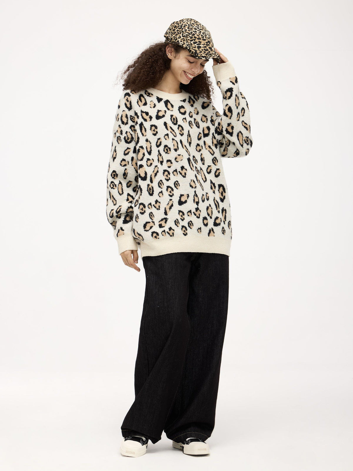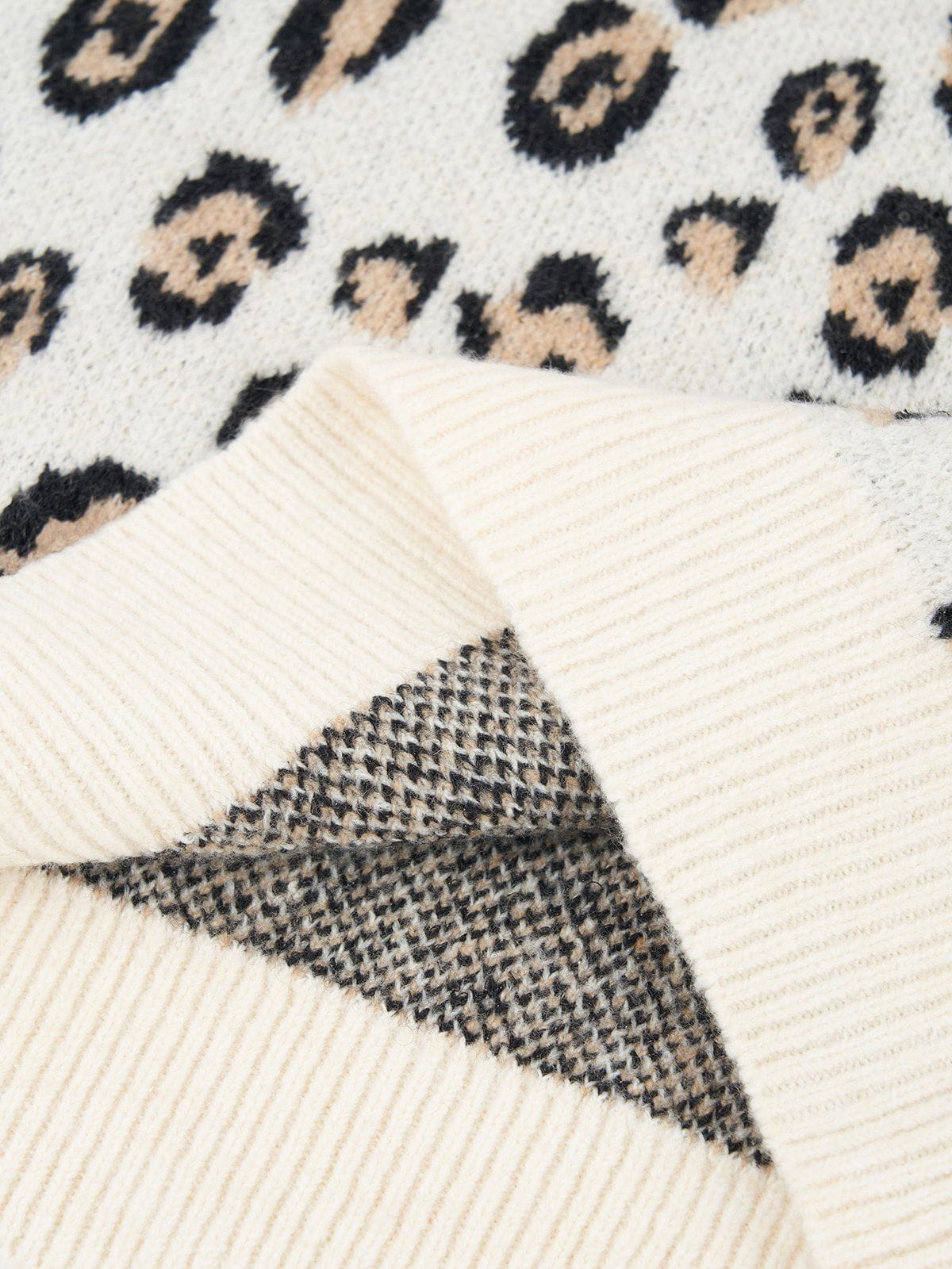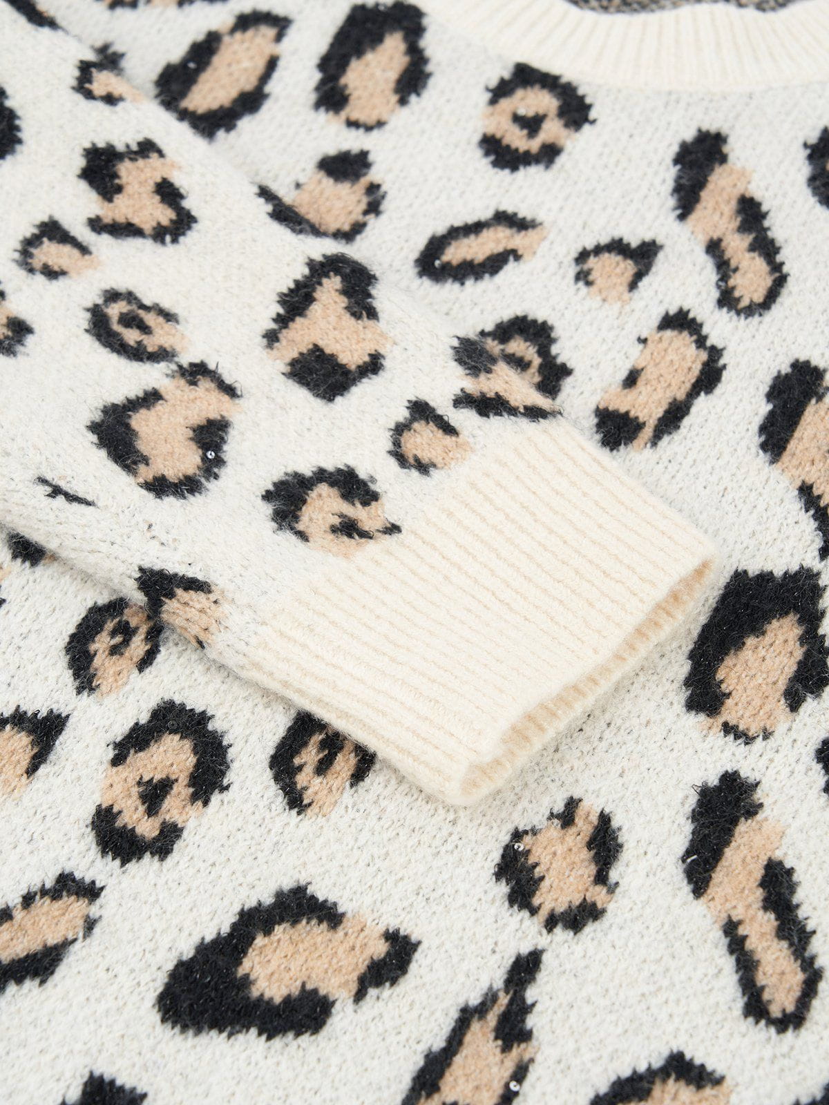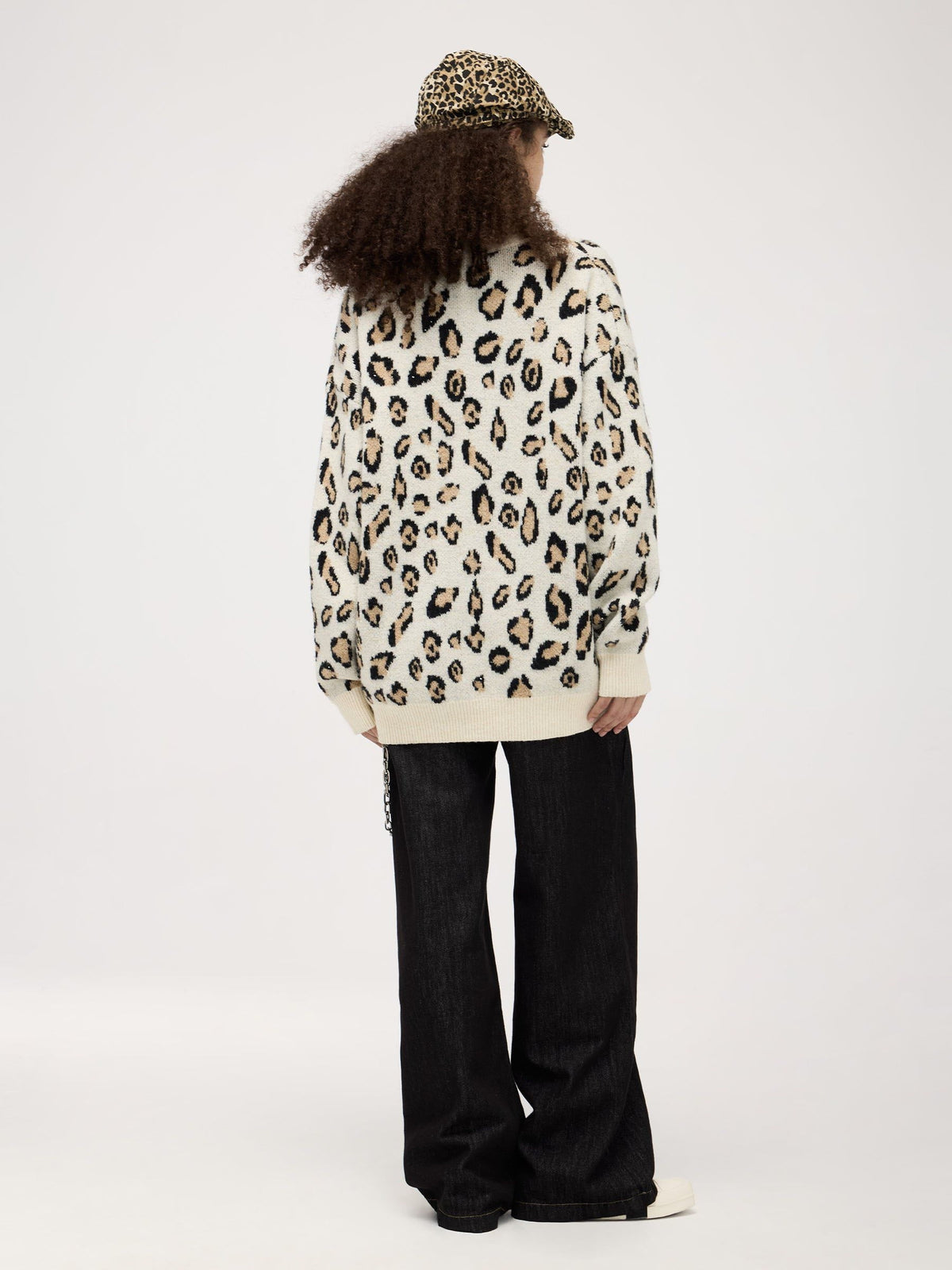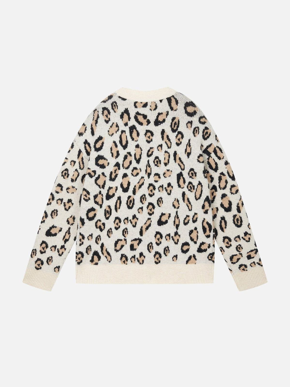 This Fvshya Apricot Leopard Print Sweater features a full leopard print design, providing a bold and eye-catching look. Perfect for adding some personality to your wardrobe, the sweater's striking pattern is sure to make a statement.