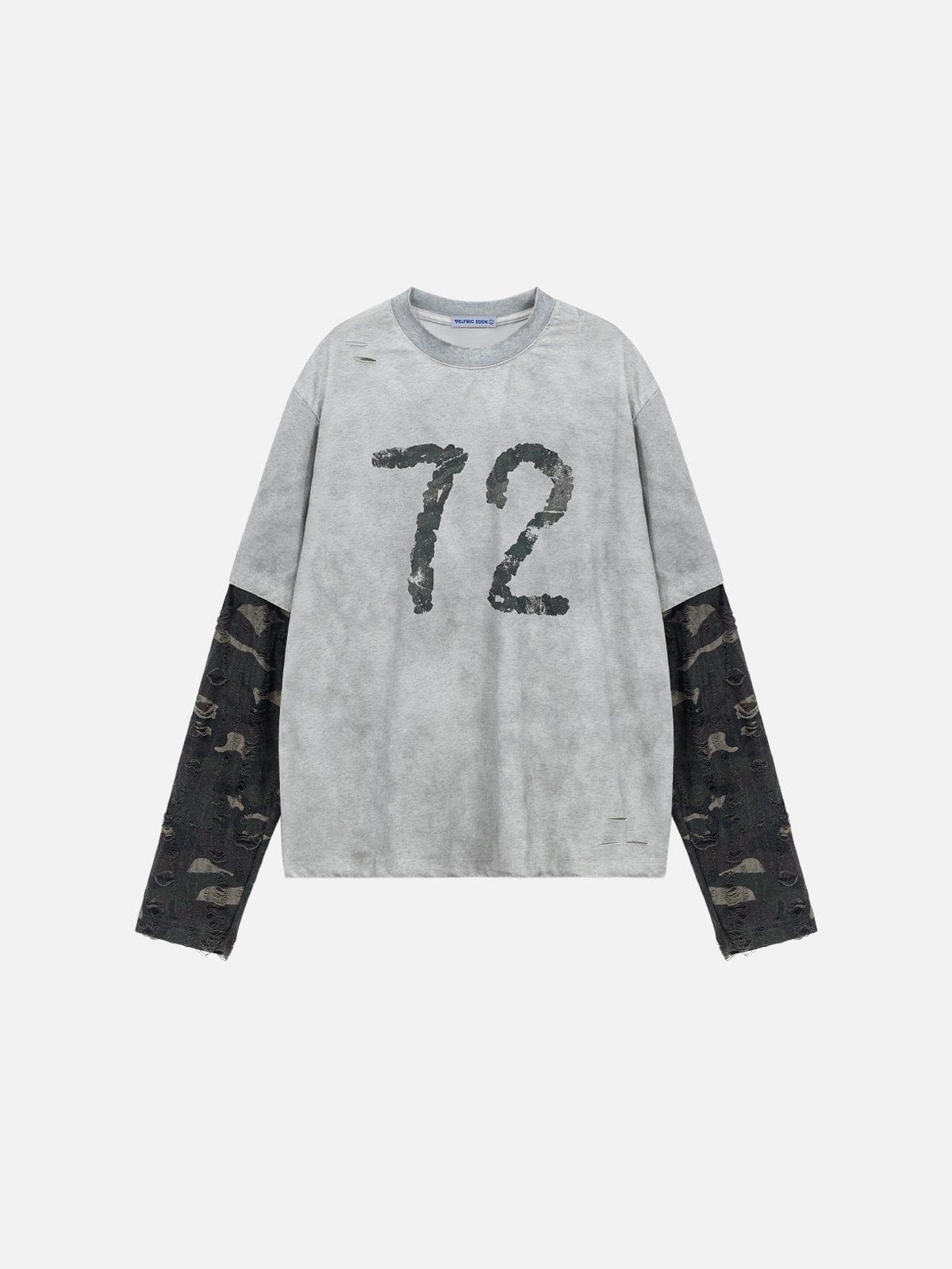 This Camouflage Distressed Long Sleeve Tee combines a worn-in short sleeve with camouflage long sleeves. A large, prominent number graphic on the chest completes the look, adding a distinctive touch to casual wear.