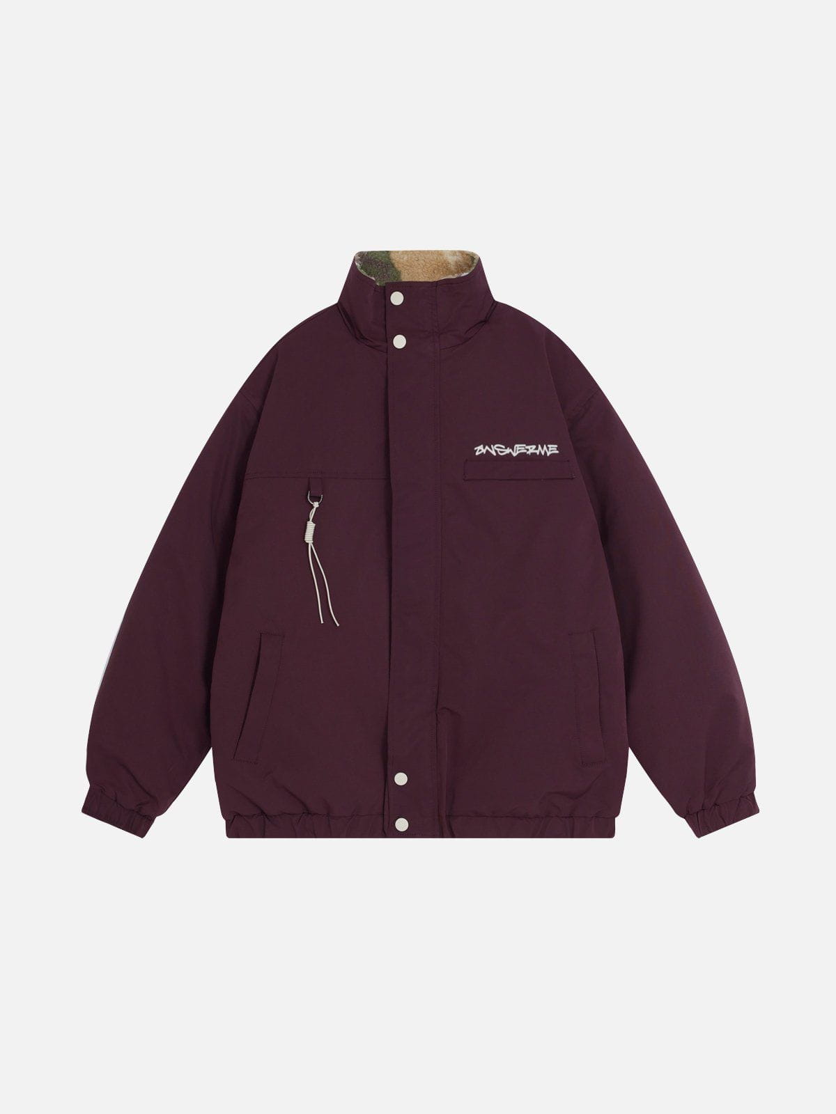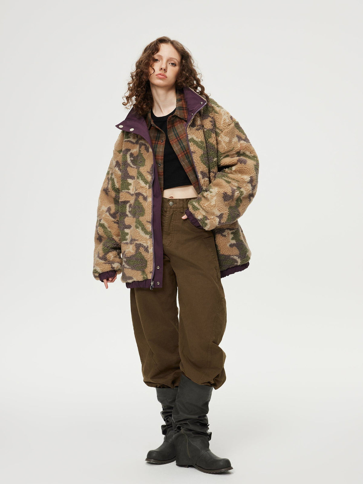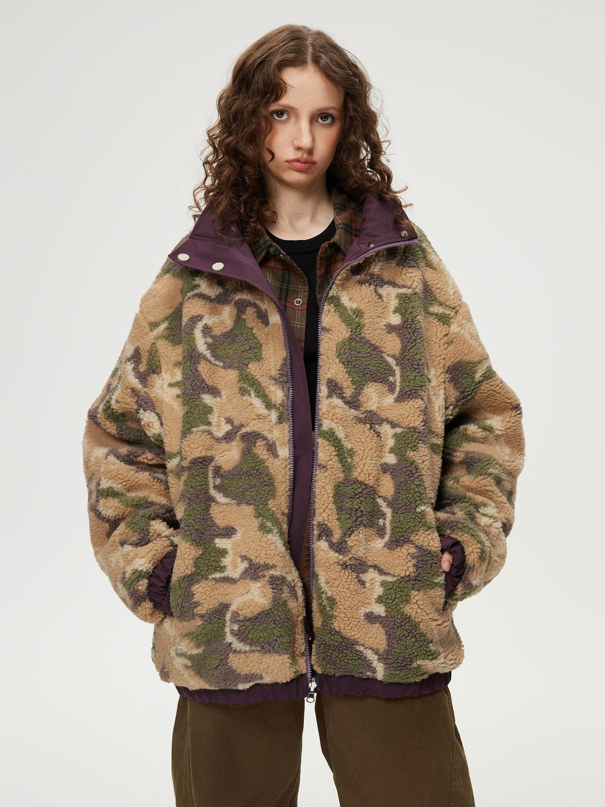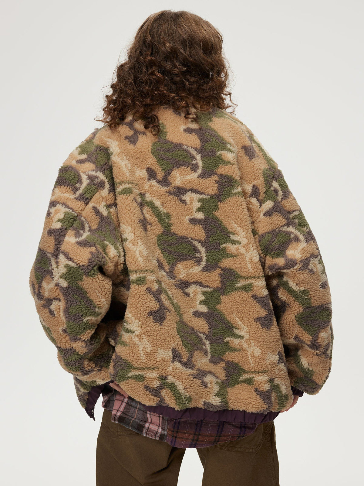 This reversible sherpa jacket combines warmth and style with its camouflage pattern and cozy texture. The stand collar adds a sleek touch, making it a practical choice for layering in cooler weather.