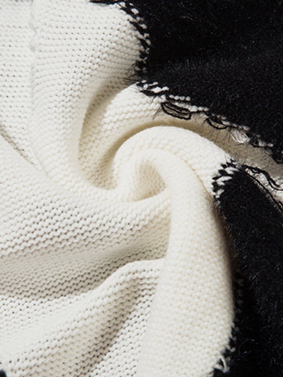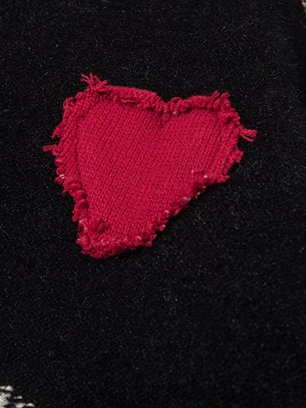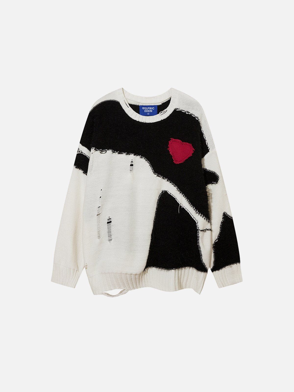 Featuring a unique color blocking design and stylish distressed style. Additional fringed heart detailing adds a touch of personality to this cozy piece. Stay warm and stylish in this essential sweater.