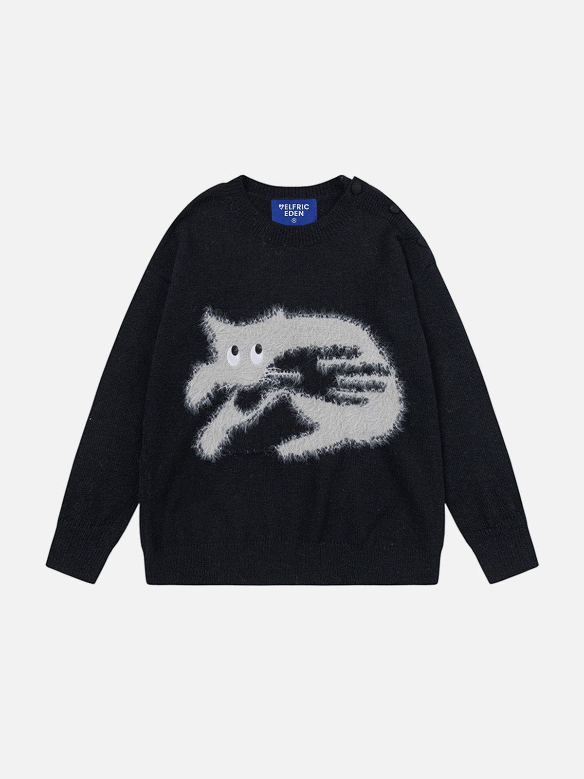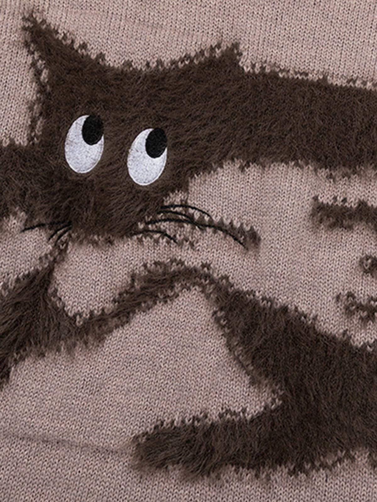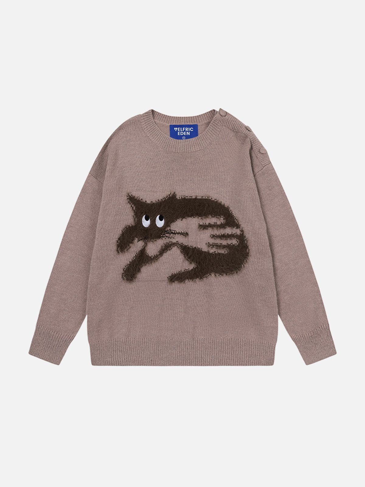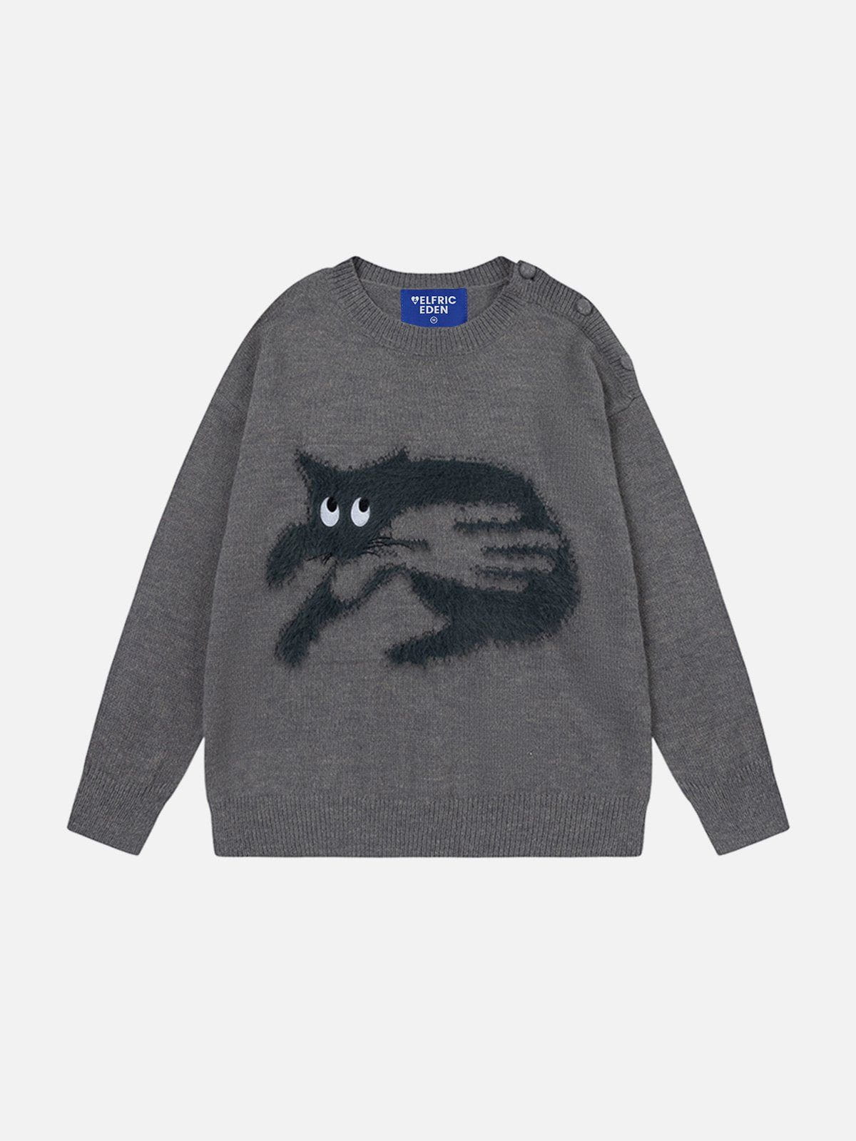 Featuring a playful cat print and textured furry design, it adds a fun and cozy touch to your look. Shoulder button detailing adds a unique element that makes it easy to match and layer.