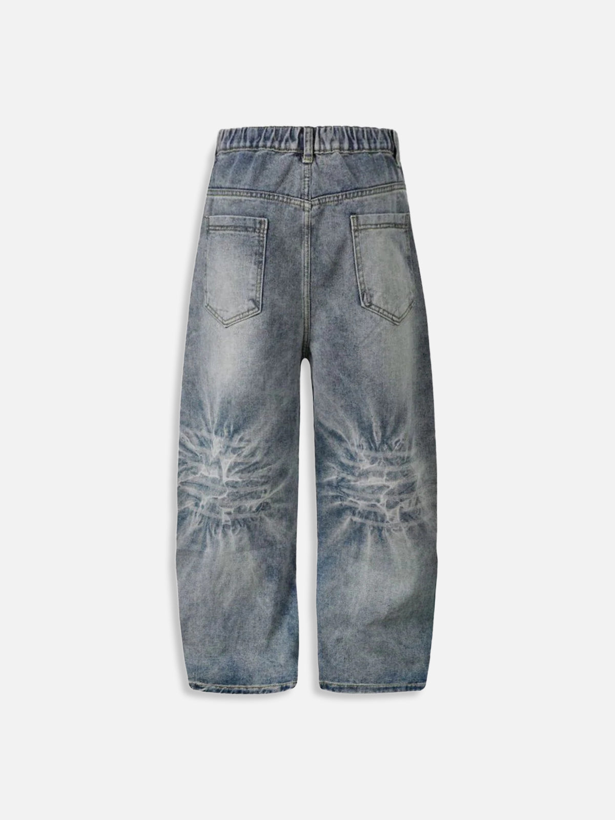 Featuring a unique curved panel design that adds a modern, artistic twist. Crafted from washed denim for a soft, vintage-inspired look, these jeans offer a perfect blend of style and comfort.