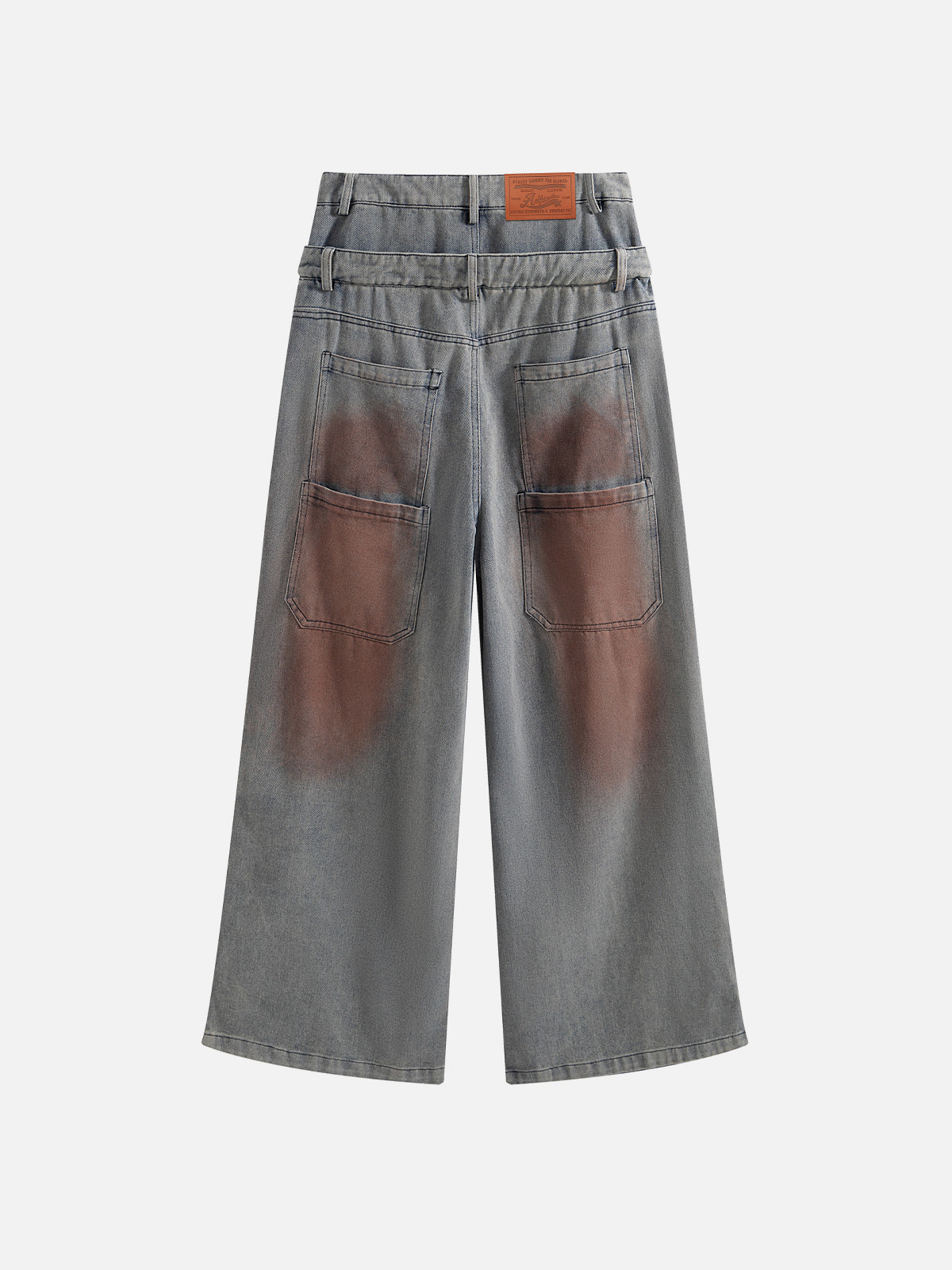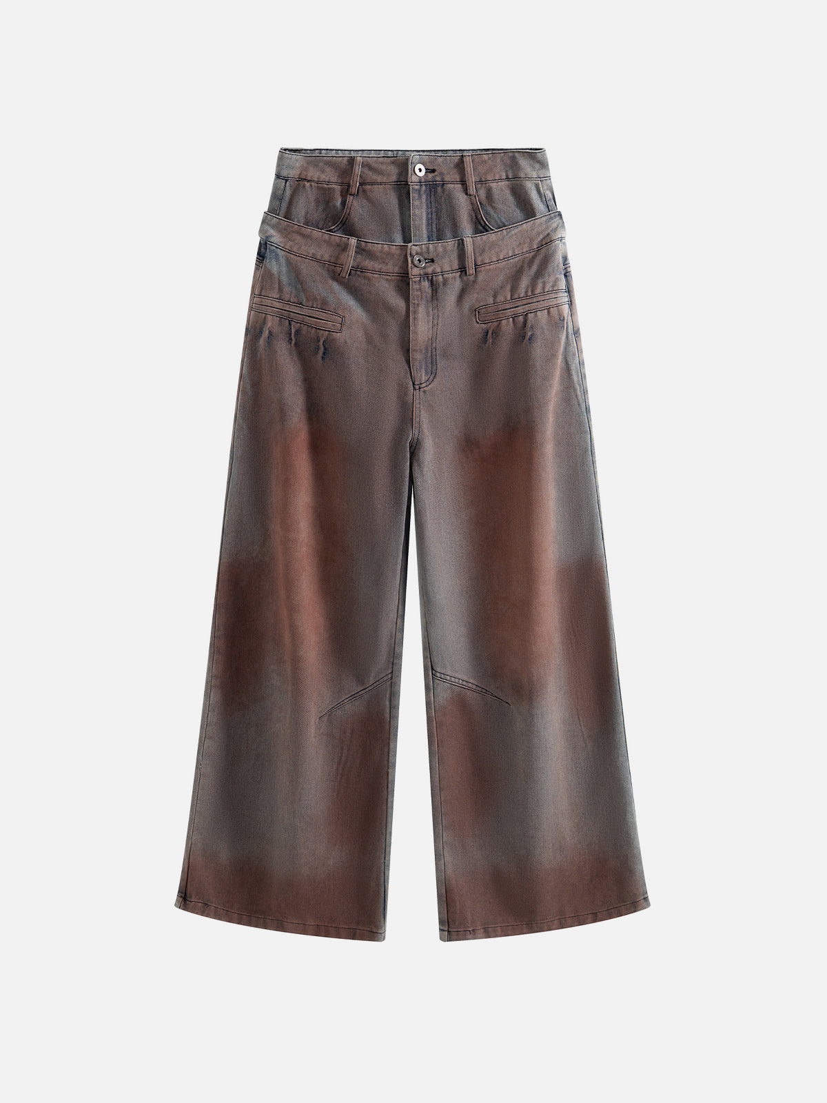 Featuring a bold earthy gradient design for a unique faux old-world aesthetic. The double waist detailing adds a striking layering effect and a modern twist to the classic silhouette. Perfect for those seeking a casual yet stylish look, these jeans bring an urban rugged vibe to your closet.