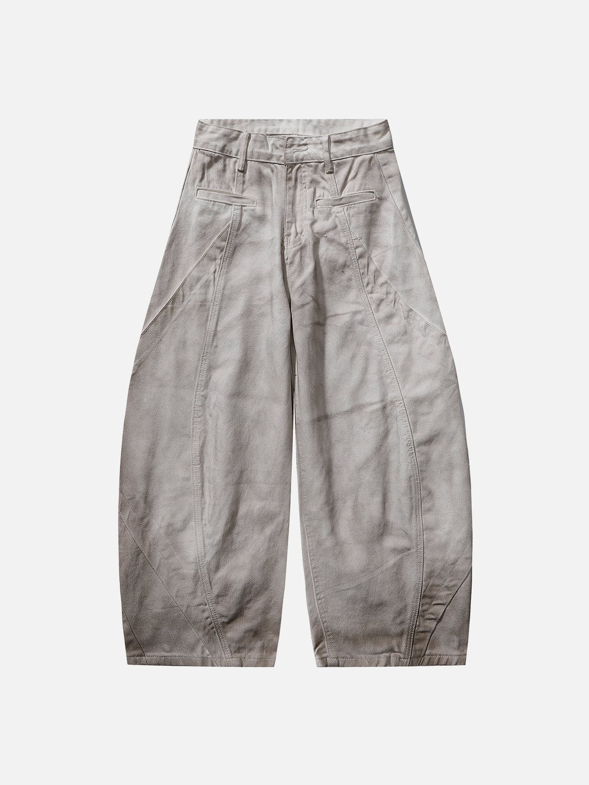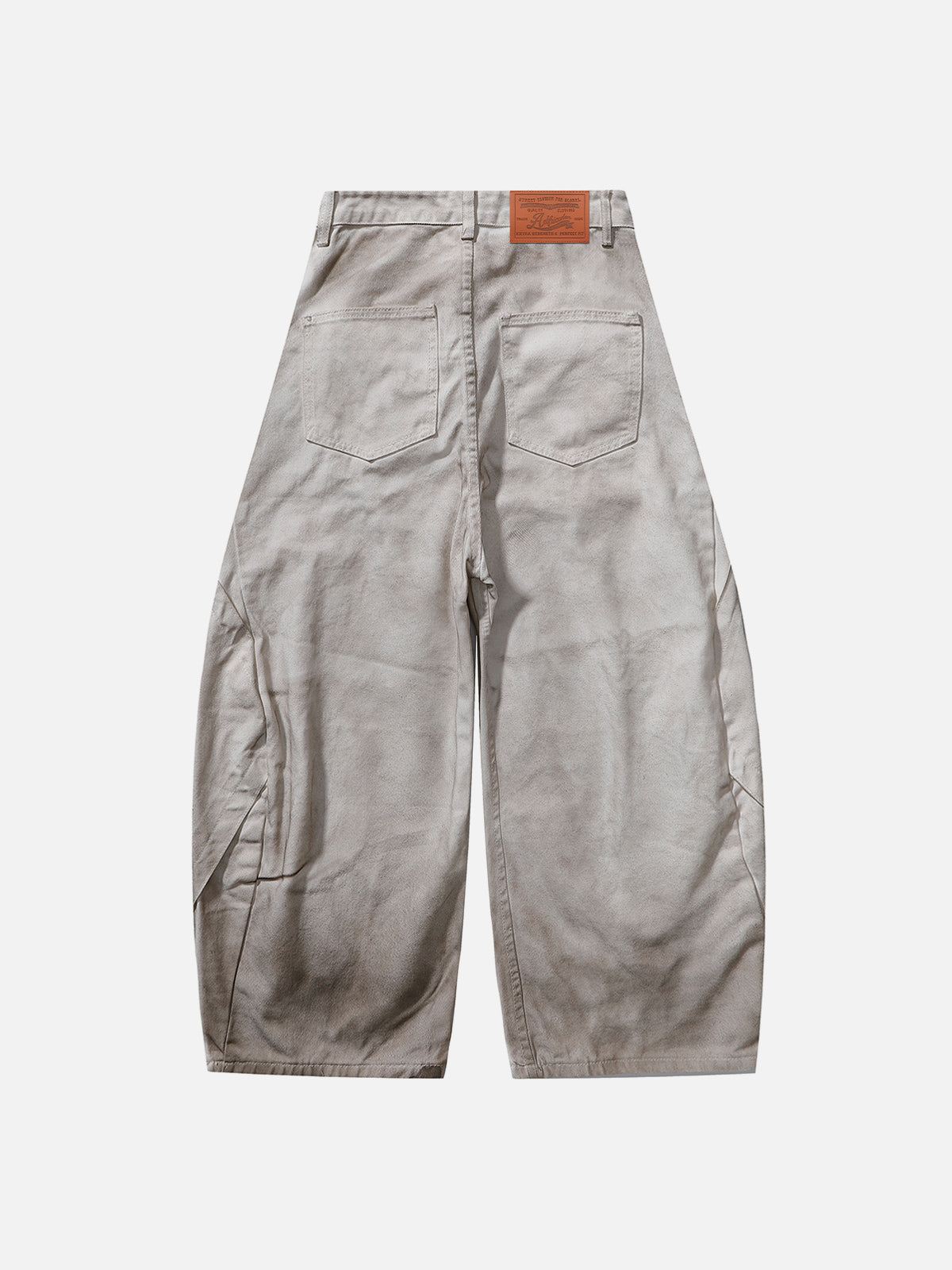 Crafted with a rugged dirt-toned wash, these jeans reinterpret classic denim through a bold barrel silhouette. Curved seam details sculpt the wide-legged shape, blending utilitarian edge with modern volume. Heavyweight fabric ensures structure while maintaining a relaxed drape.