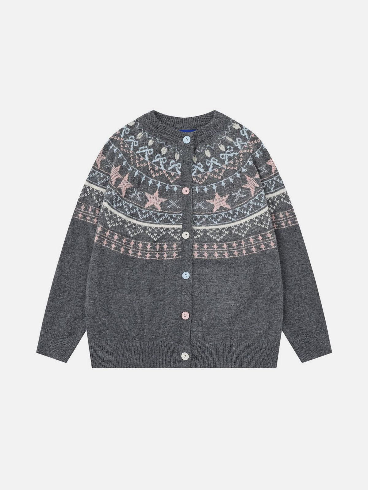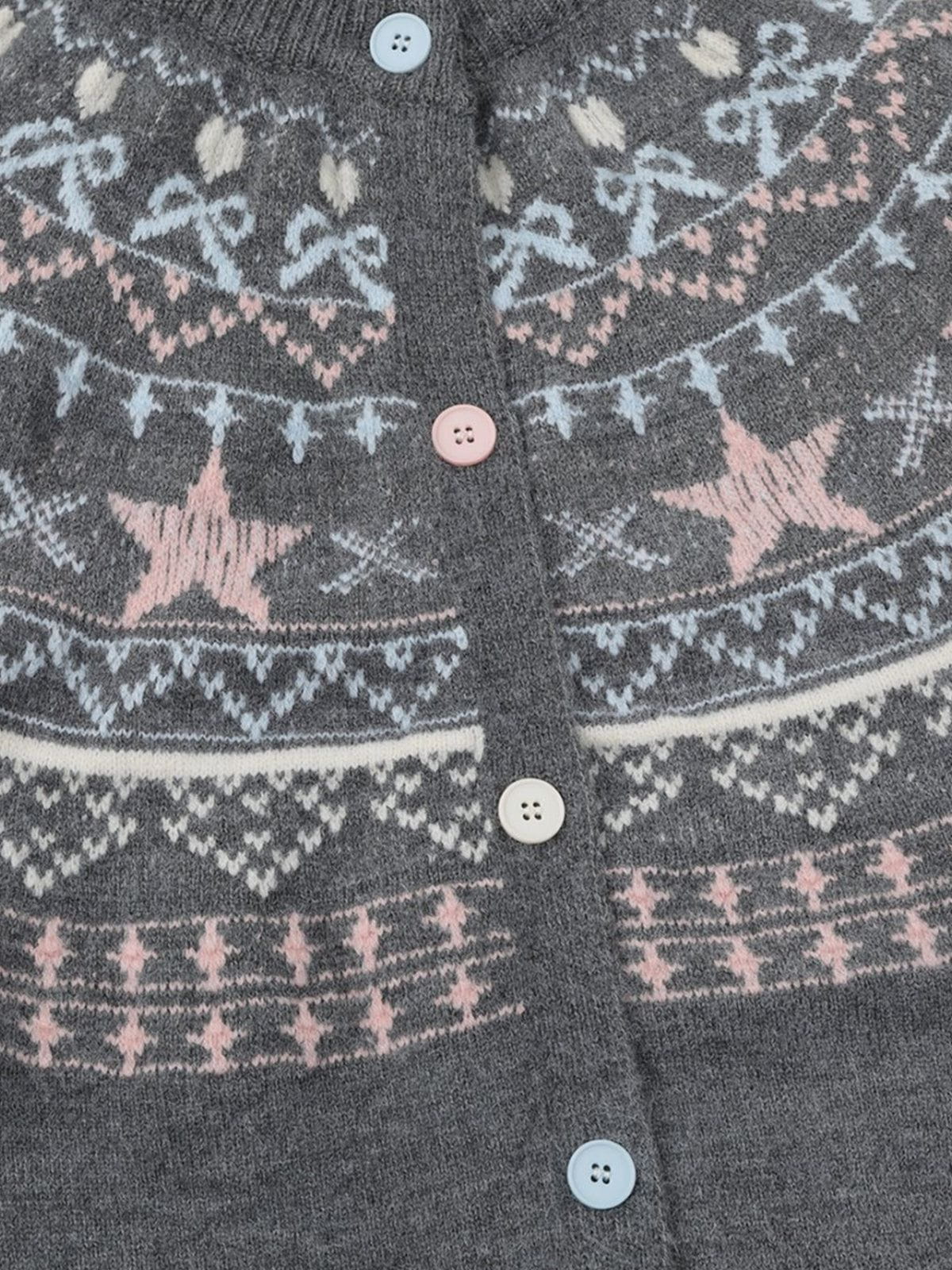 Add a playful touch to your wardrobe with the Fvshya Fair Isle Cardigan, featuring charming star patterns and delicate bow details. This cozy cardigan blends classic Fair Isle style with whimsical accents, making it a unique statement piece that brings both warmth and personality to any outfit.