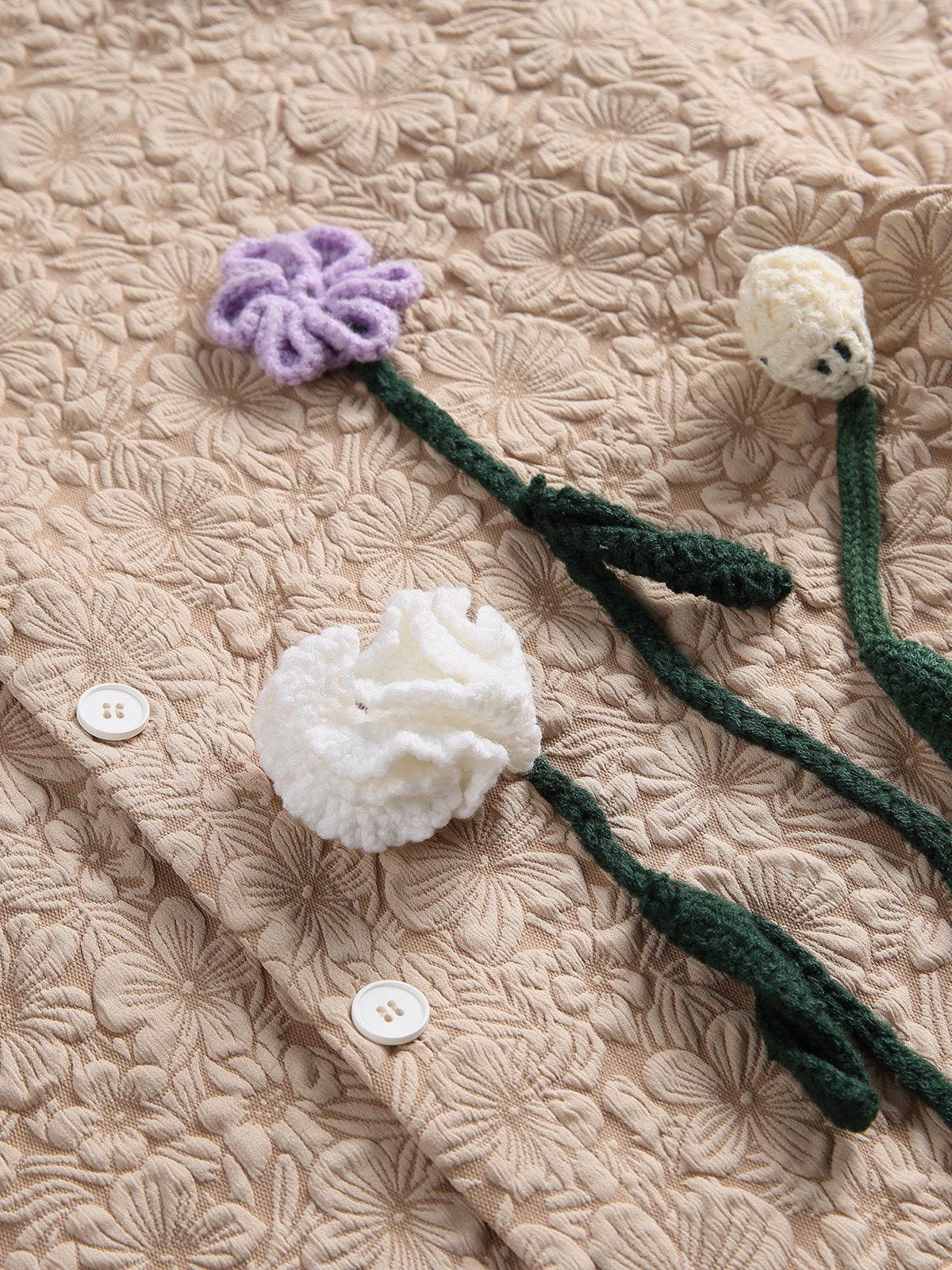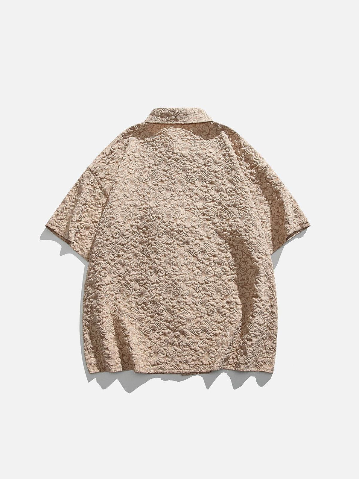 The shirt showcases intricate design elements. Its fabric boasts a subtle floral patterned texture, adding depth and dimension to the overall look. Additionally, the handcrafted woven floral bouquet design on one side of the shirt adds a touch of sophistication and refinement. This clever design not only demonstrates the designer's attention to detail but also imbues the shirt with a sense of luxury and elegance.