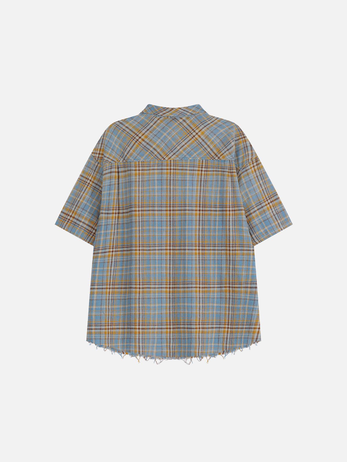 The graduated plaid pattern in warm shades of blue and brown adds a vintage vibe, while the frayed hem gives it a distressed, worn look reminiscent of a classic labor shirt. A utility chest pocket with embroidered detailing enhances the workwear vibe, making it the perfect layering piece for effortlessly rugged casual wear.