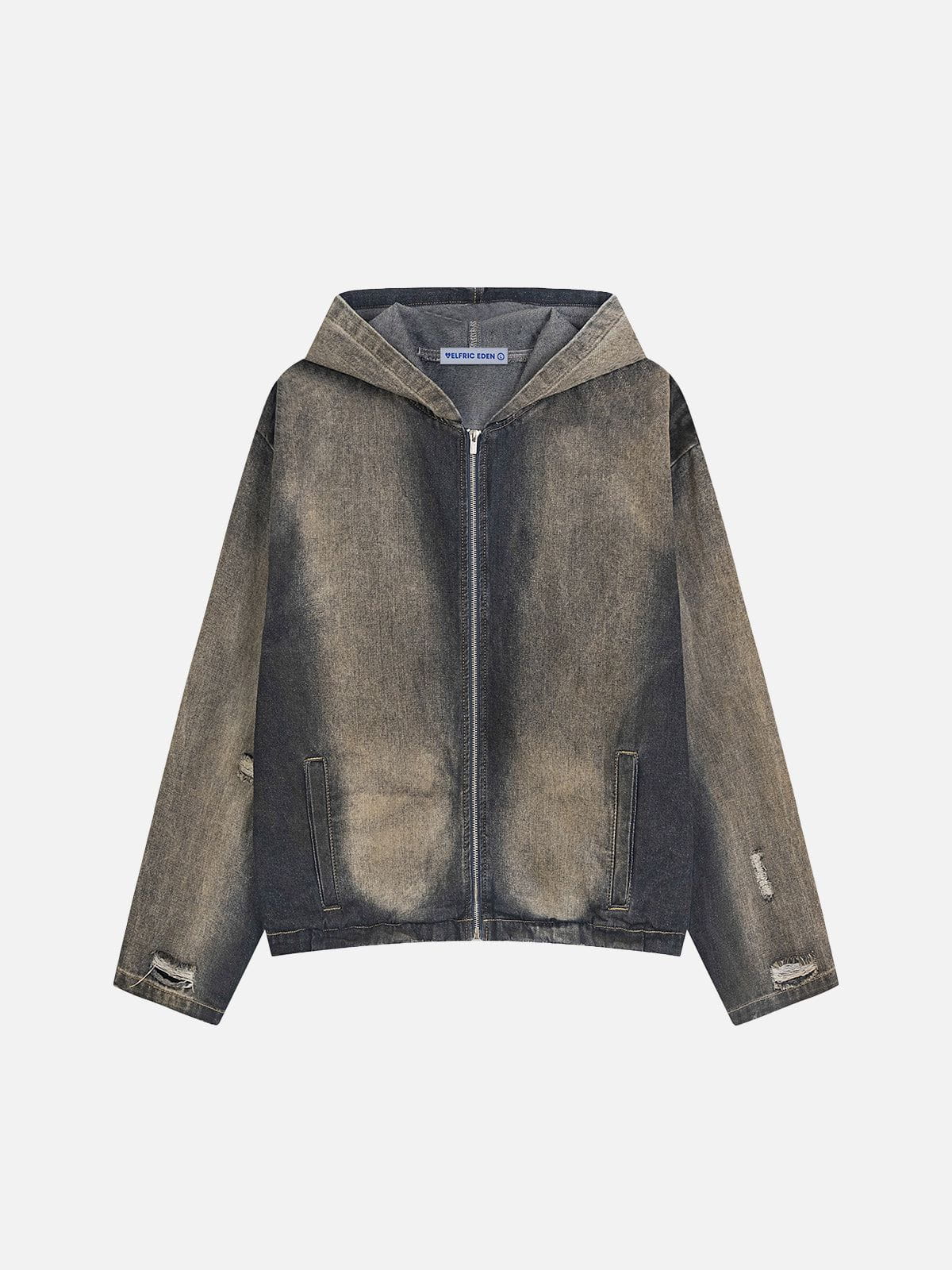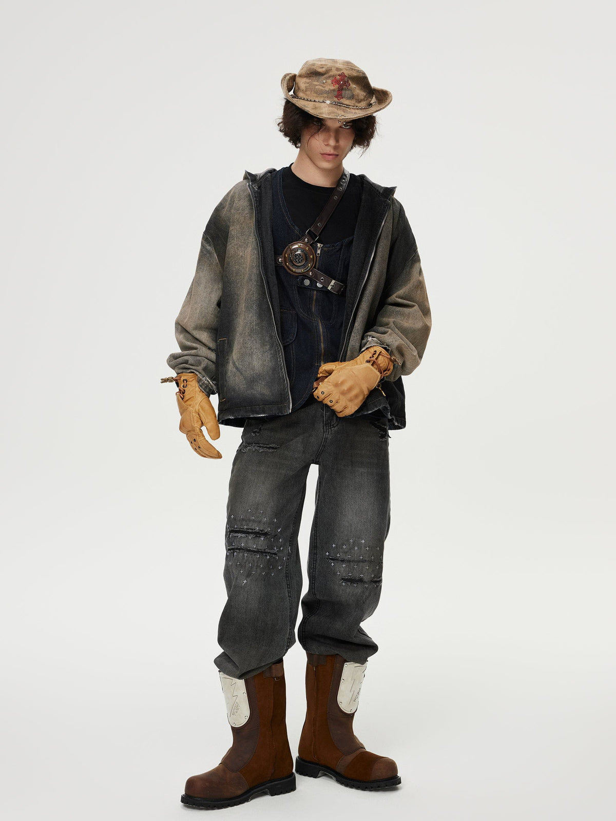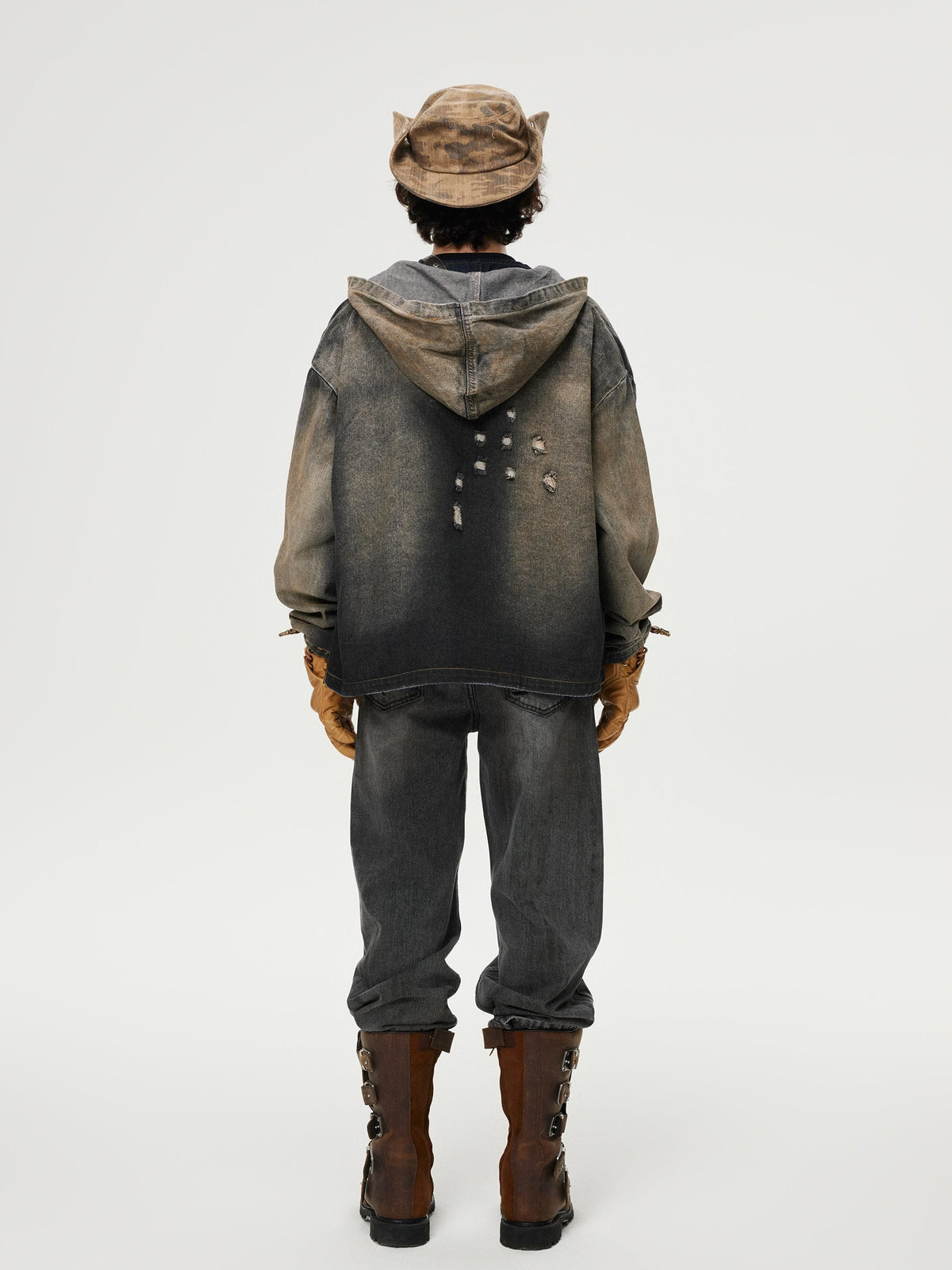 What comes to mind is a shabby vintage aesthetic. The distressed detailing on the cuffs adds to the rugged edginess, and the loose fit and hooded design make it both cozy and stylish. Perfect for layering, this piece blends street style with a casual, lived-in vibe.