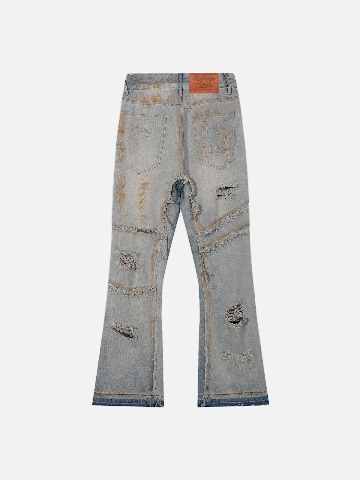 Channeling vintage grit with a rebellious streak, these jeans feature an all-over distressed finish and bold mud-dye effect. The bootcut silhouette adds a subtle throwback flair, while the jagged rips and frayed textures create depth and edge. A perfect statement piece for anyone who thrives on raw aesthetics and retro-inspired streetwear.