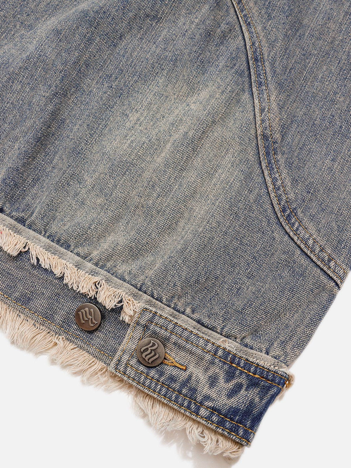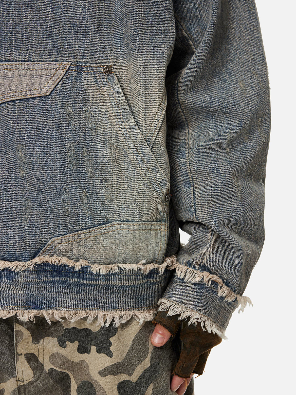Step up your streetwear game with this edgy hoodie, featuring washed denim paneling for a bold, contrasting look. The color-block design adds a fresh twist, while the raw, frayed edges bring a touch of distressed charm.