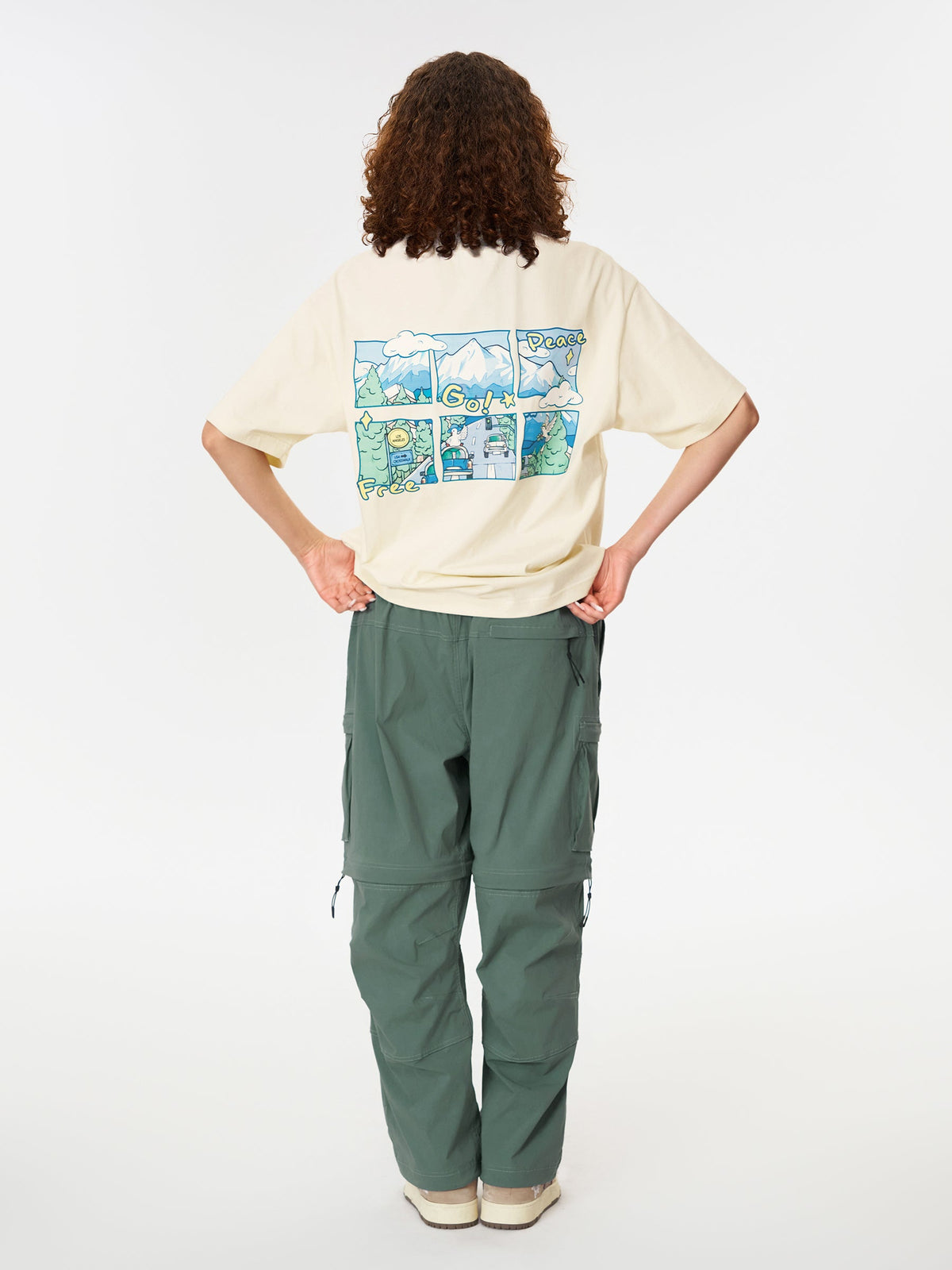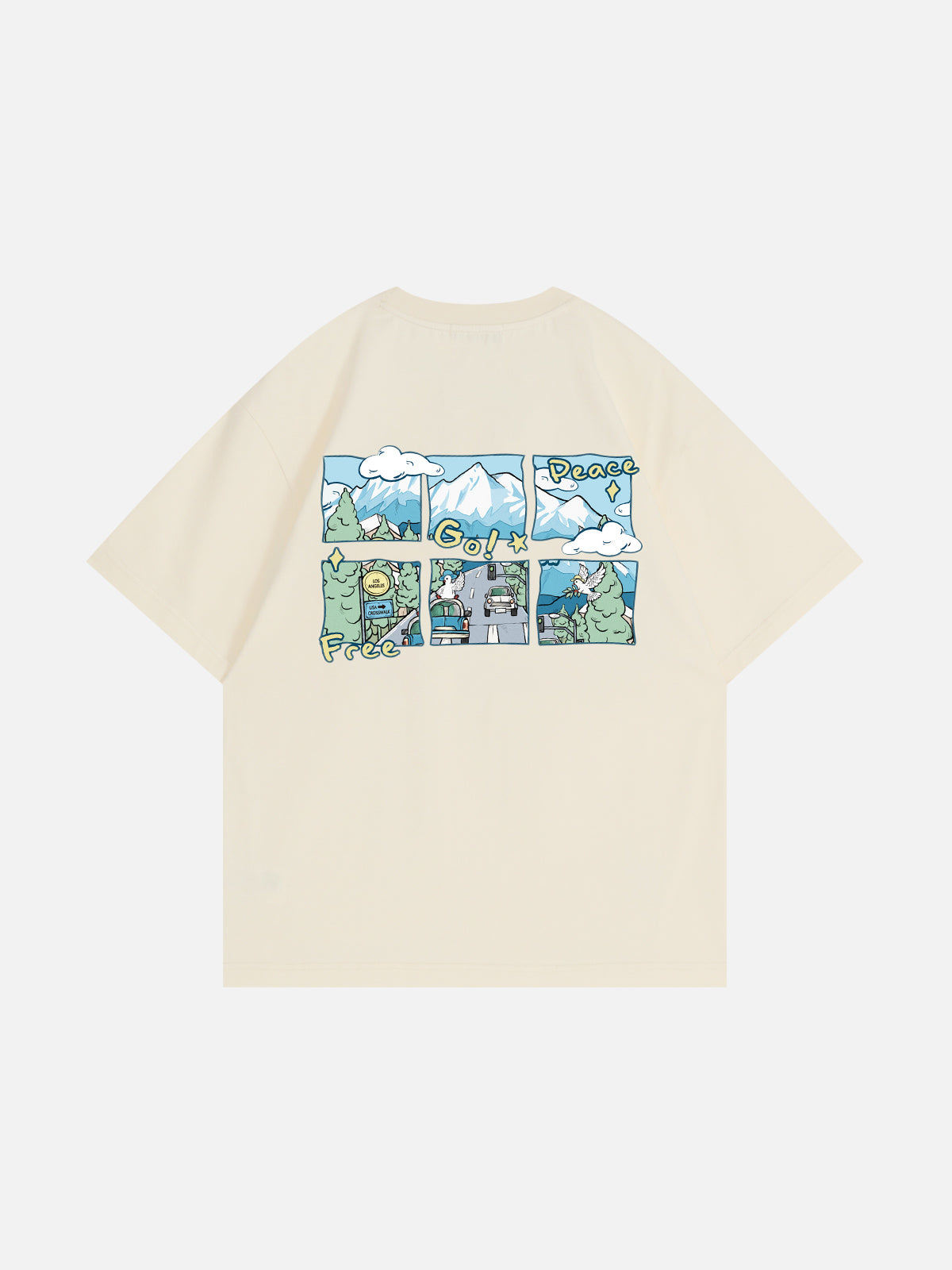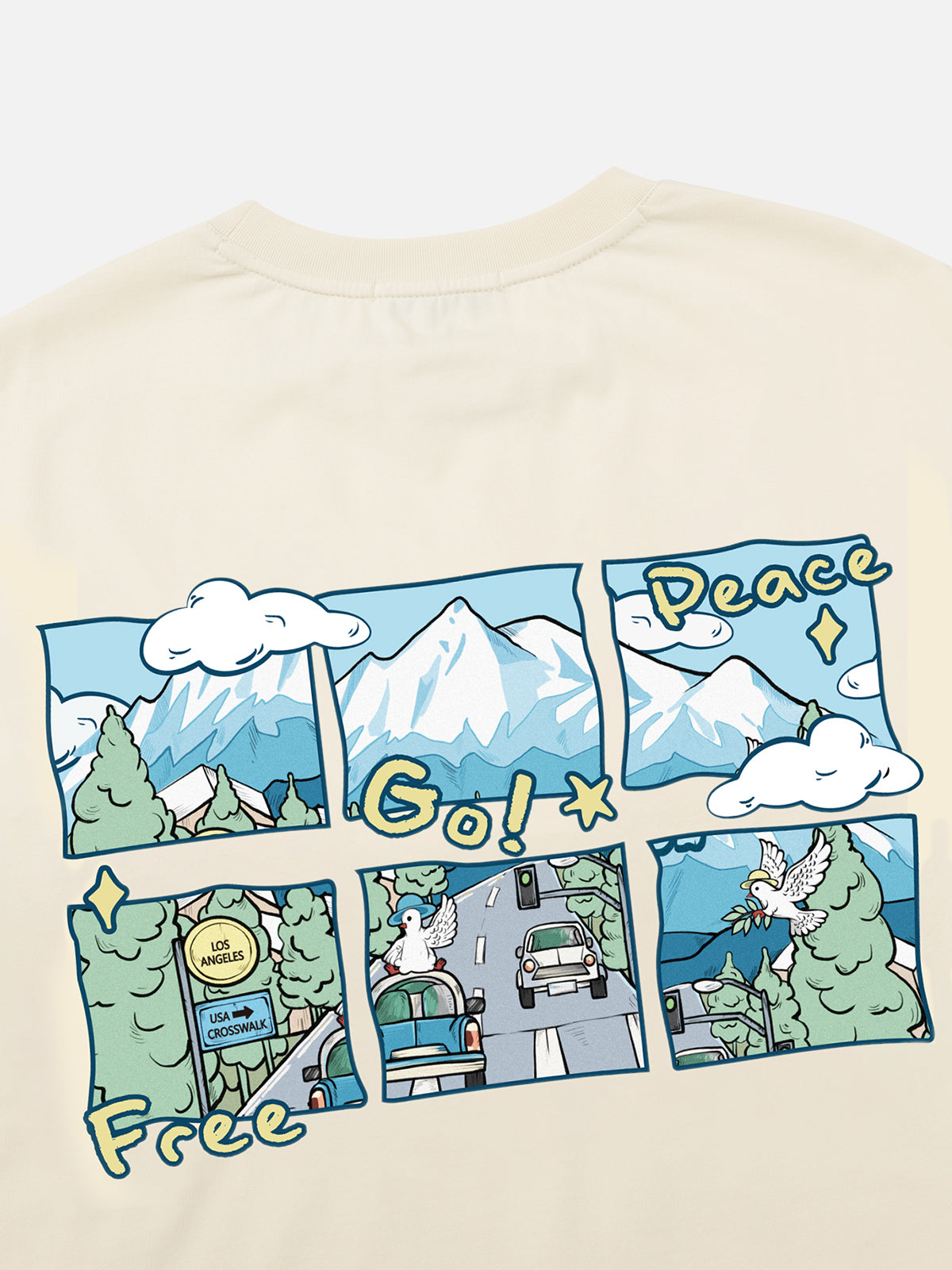 Embrace a free-spirited vibe with this statement graphic tee. Featuring bold "Peace, Free, Go" lettering alongside a scenic print of open roads, blue skies, and soaring doves, this design captures the essence of adventure and freedom.