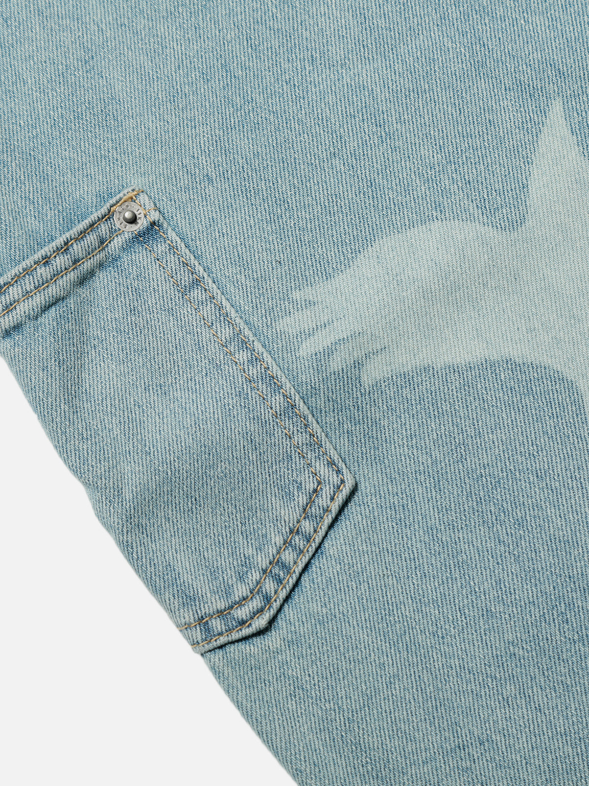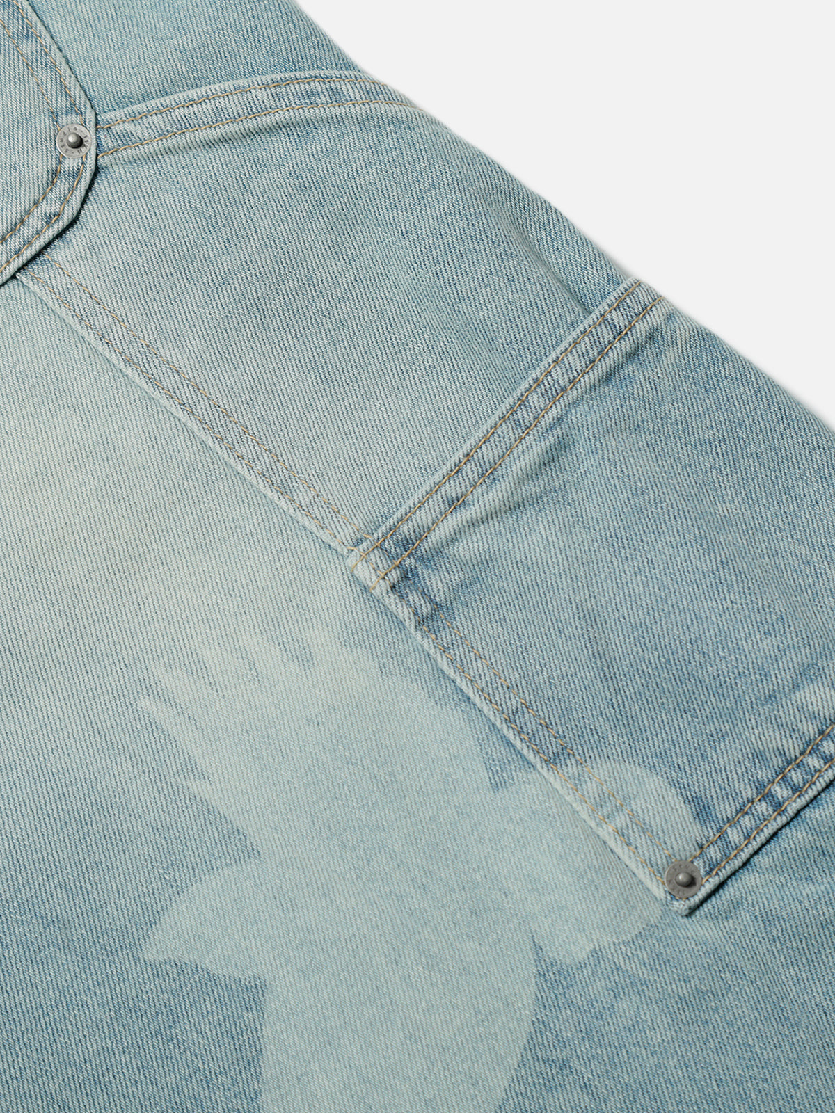 intage-washed in a soft light blue and finished with playful pigeon prints, these jeans bring personality to every outfit. The distressed effect adds effortless edge, while the dual-knee panel design boosts durability where it counts. Say goodbye to basic—hello to style with a story.