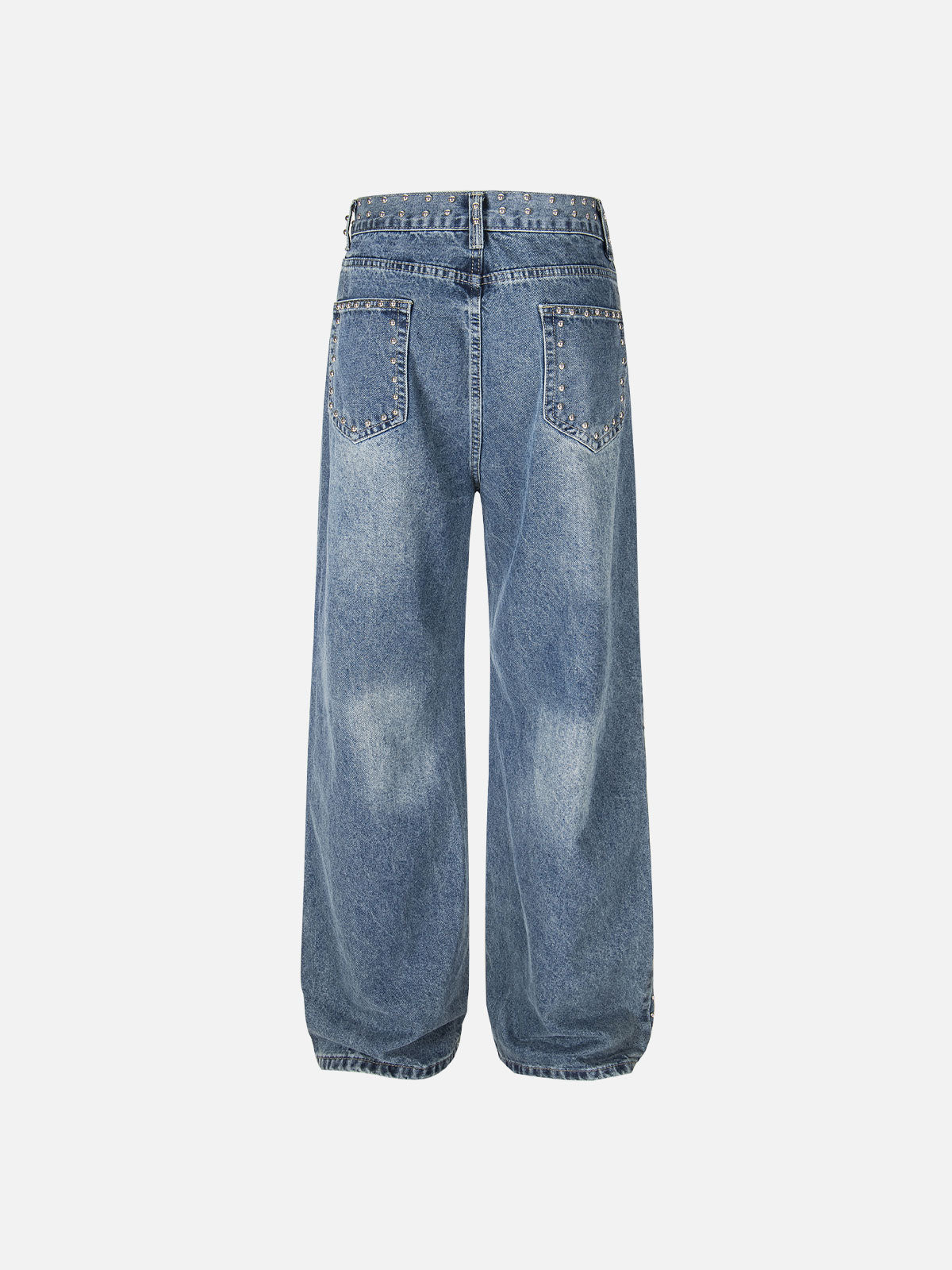 These jeans feature a distinctive rivet-adorned waistband, adding a bold, industrial edge to the classic baggy silhouette. The washed finish provides a vintage aesthetic, making them a versatile addition to any wardrobe.