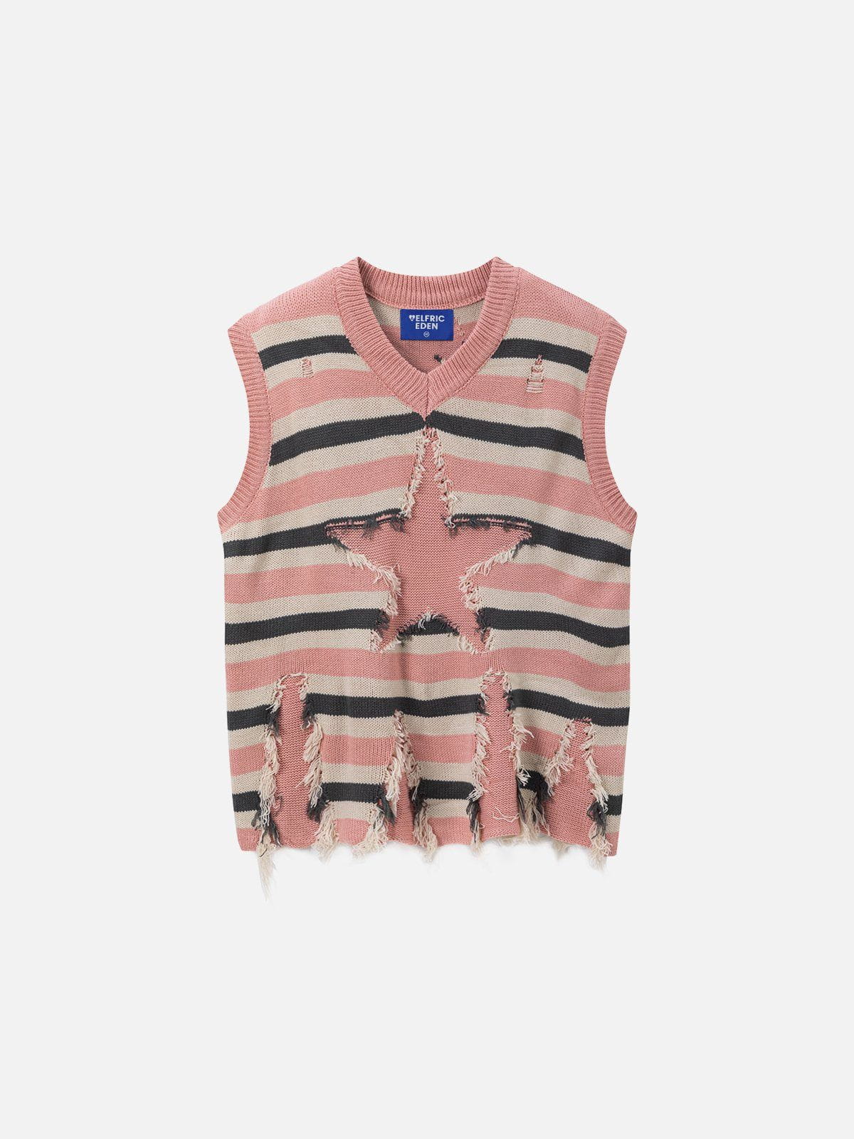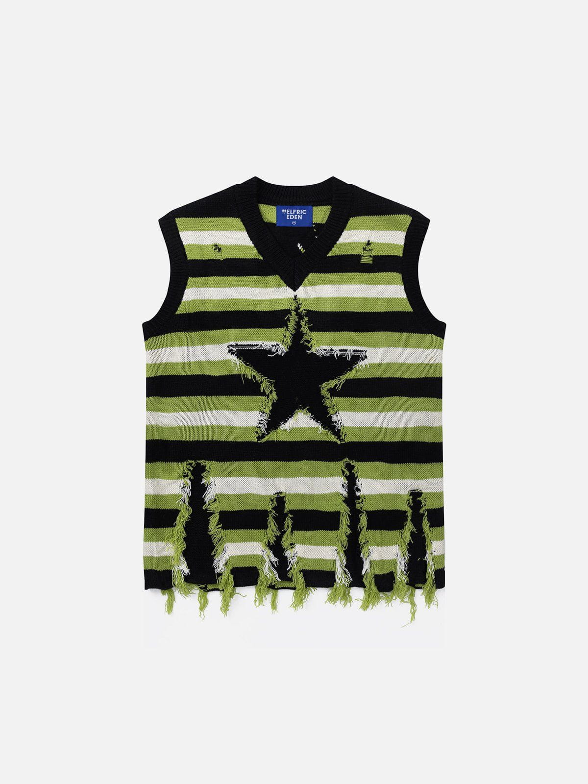 Introducing the star stripe v-neck sweater vest. Made with high-quality materials and a classic v-neck design, this vest is perfect for layering and adding a touch of sophistication to any outfit. With its versatile stripe pattern, you can easily dress it up or down for any occasion.