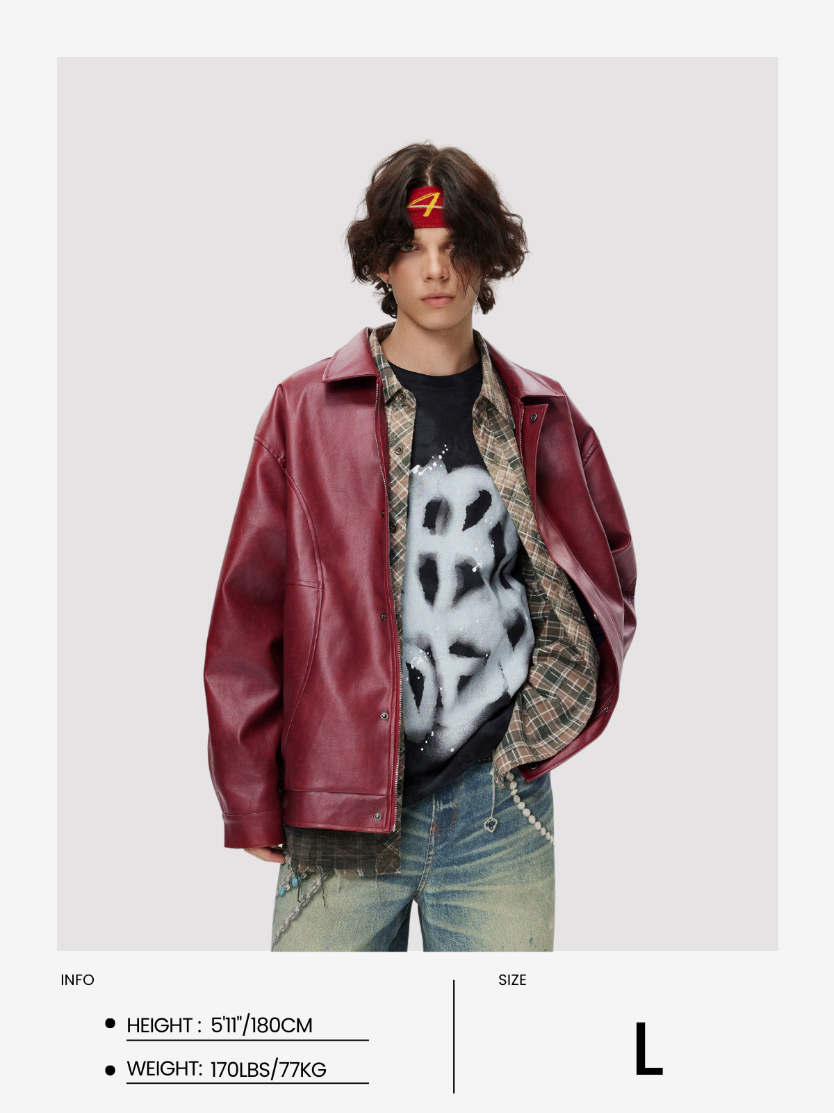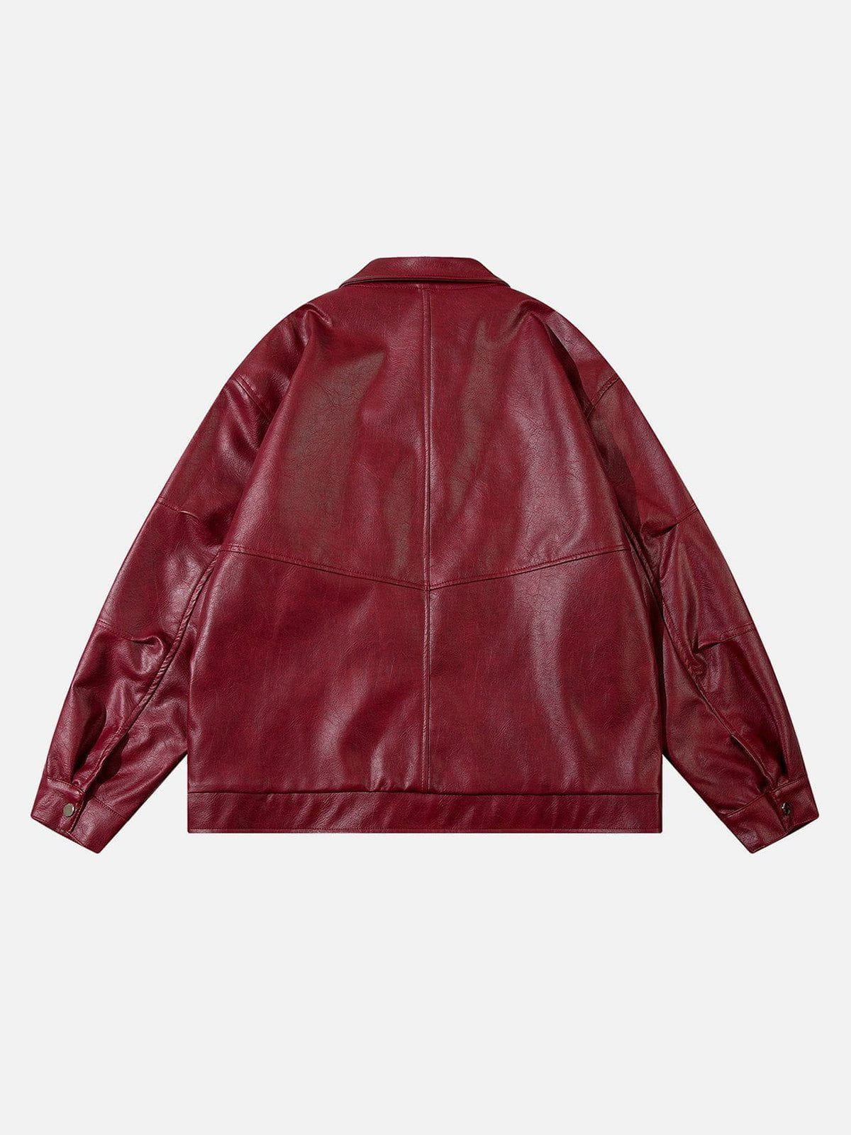 This eye-catching jacket is characterized by a retro burgundy color. Its strong sense of weight reminds you of the elegance of the retro era; while the modern design gives it a fashionable atmosphere. It is made of high-quality artificial leather with textured embellishments. Adds a unique texture. This jacket combines the perfect balance of modern and retro, showing the charm of both fashion and elegance.