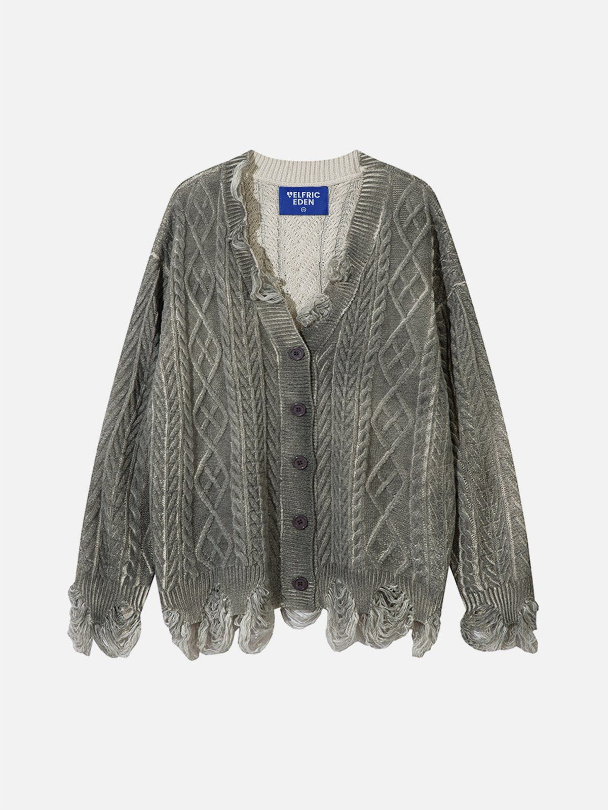 Fvshya Washed Distressed Cardigan features a vintage wash and distressed details, adding a heavy, textured feel. This design brings depth and a rugged look to the cozy cardigan.